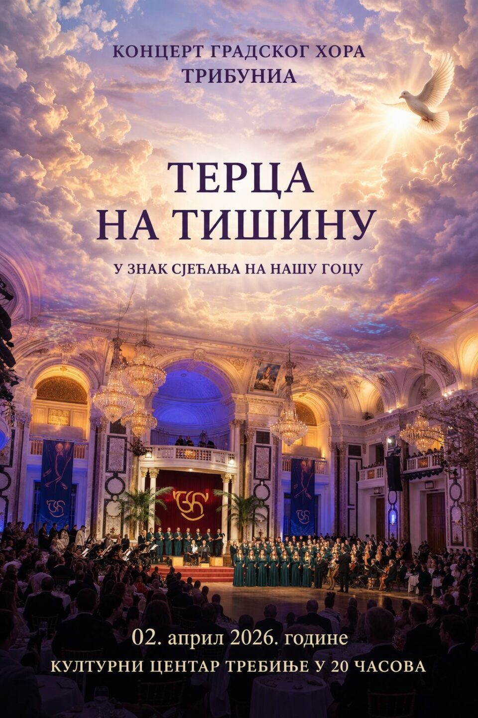 U pozorišnoj sali Kulturnog centra Trebinje, u četvrtak, 2. aprila u 20 časova biće održan koncert Gradskog hora Tribunia, pod nazivom “Terca na tišinu”, posvećen nedavno preminuloj Gordani Goci Kovačini, dugogodišnjem članu hora Tribunia.