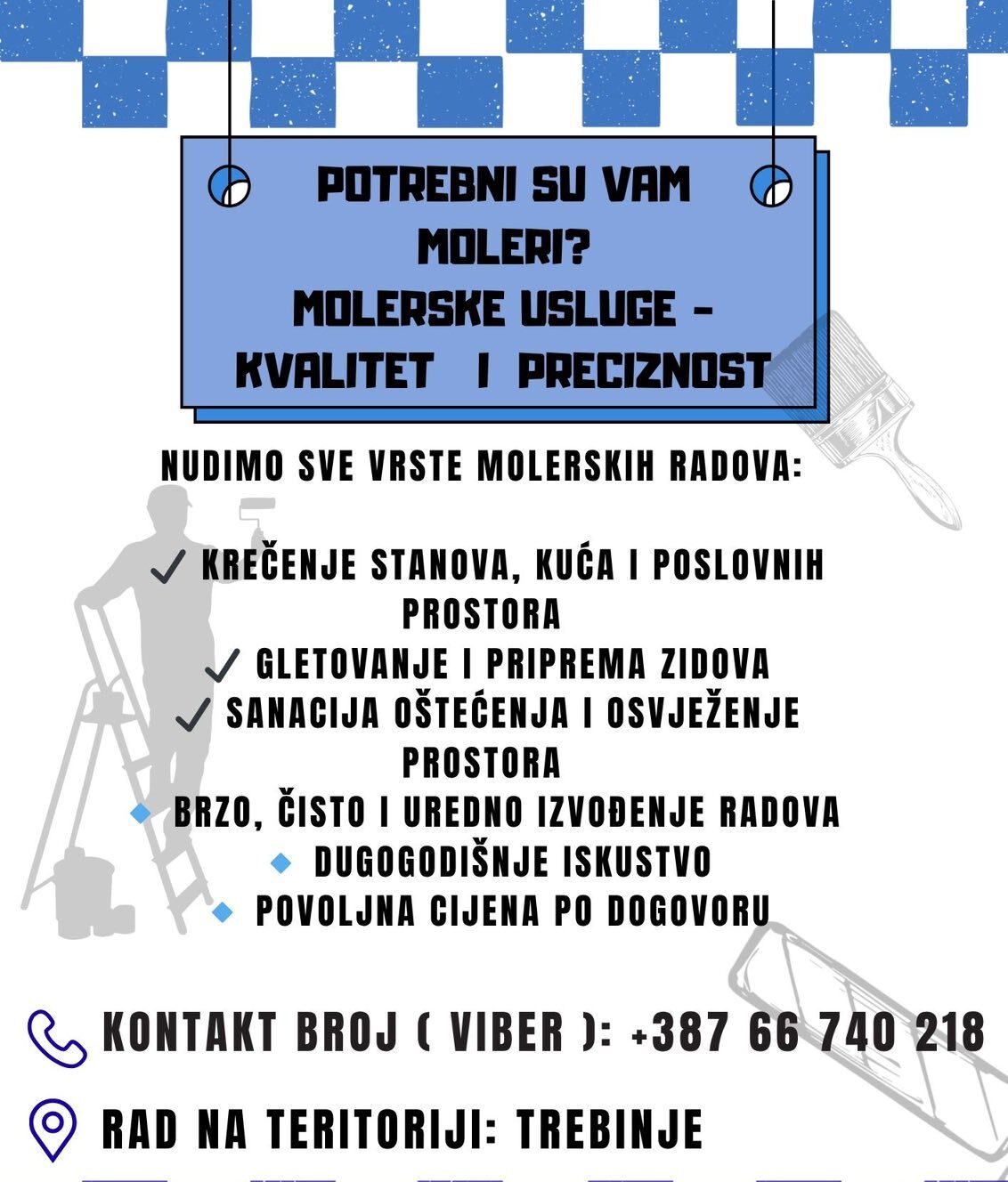 Na području Trebinja dostupne su profesionalne molerske usluge koje obuhvataju sve vrste radova u stambenim, poslovnim i drugim prostorima.