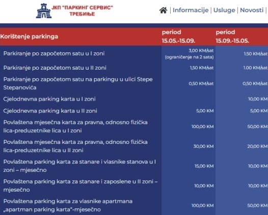 Cijene parkinga u Trebinju