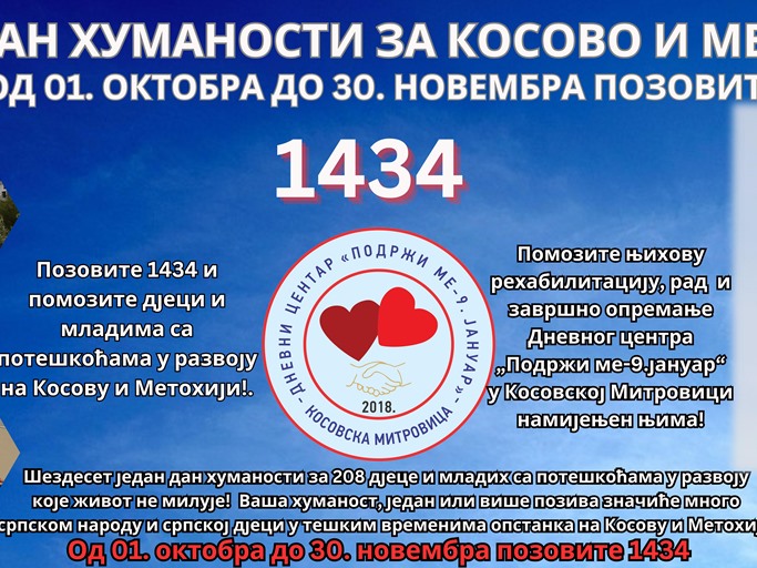 Od 1. oktobra do 30. novembra aktivan je humanitarni broj 1434 u okviru kampanje „61 dan humanosti za Kosovo i Metohiju“, koju sprovodi Odbor za pomoć Kosovu i Metohiji iz Republike Srpske.