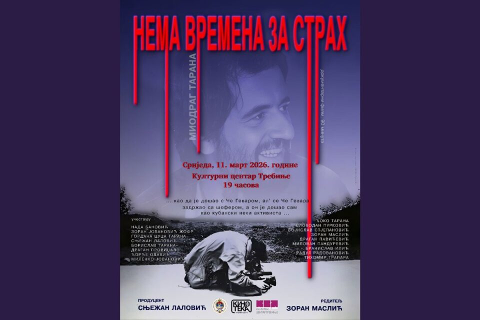 TREBINJE – Film o Miodragu Tarani „Nema vremena za strah“, priča o jednom od najtalentovanijih filmskih i kulturnih radnika Republike Srpske i bivše Jugoslavije, biće prikazan 11. marta u 19 časova u Kulturnom centru Trebinje.