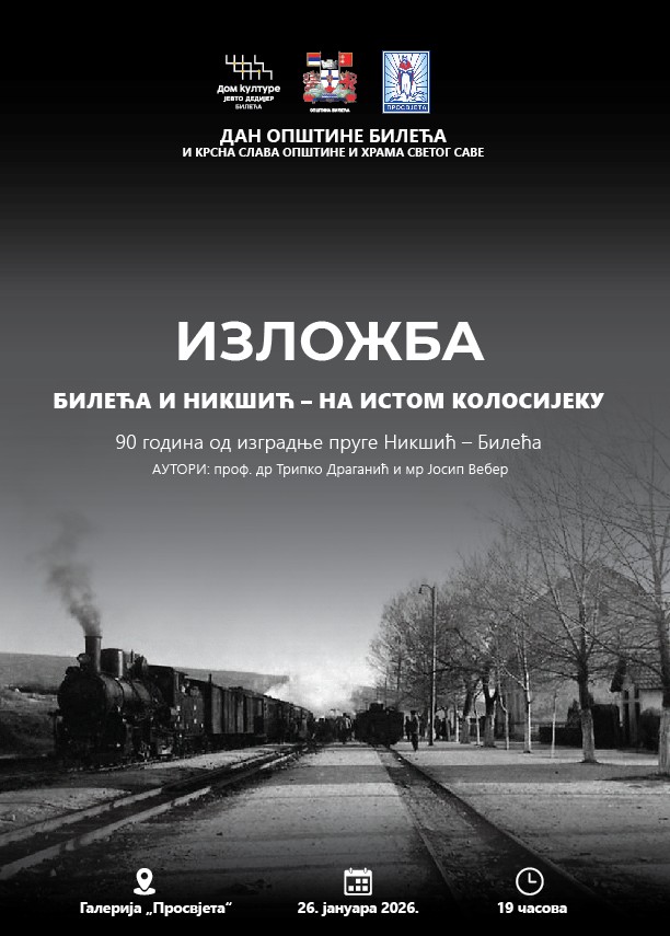 Povodom obilježavanja Dana opštine Bileća, kao i krsne slave opštine i krsne slave Hrama Svetog Save, u ponedjeljak, 26. januara, sa početkom u 19.00 časova, u Galeriji „Prosvjeta“ biće otvorena dokumentarna fotografska izložba pod nazivom „Bileća i Nikšić – na istom kolosijeku“, povodom 90 godina od izgradnje željezničke pruge Bileća – Nikšić.