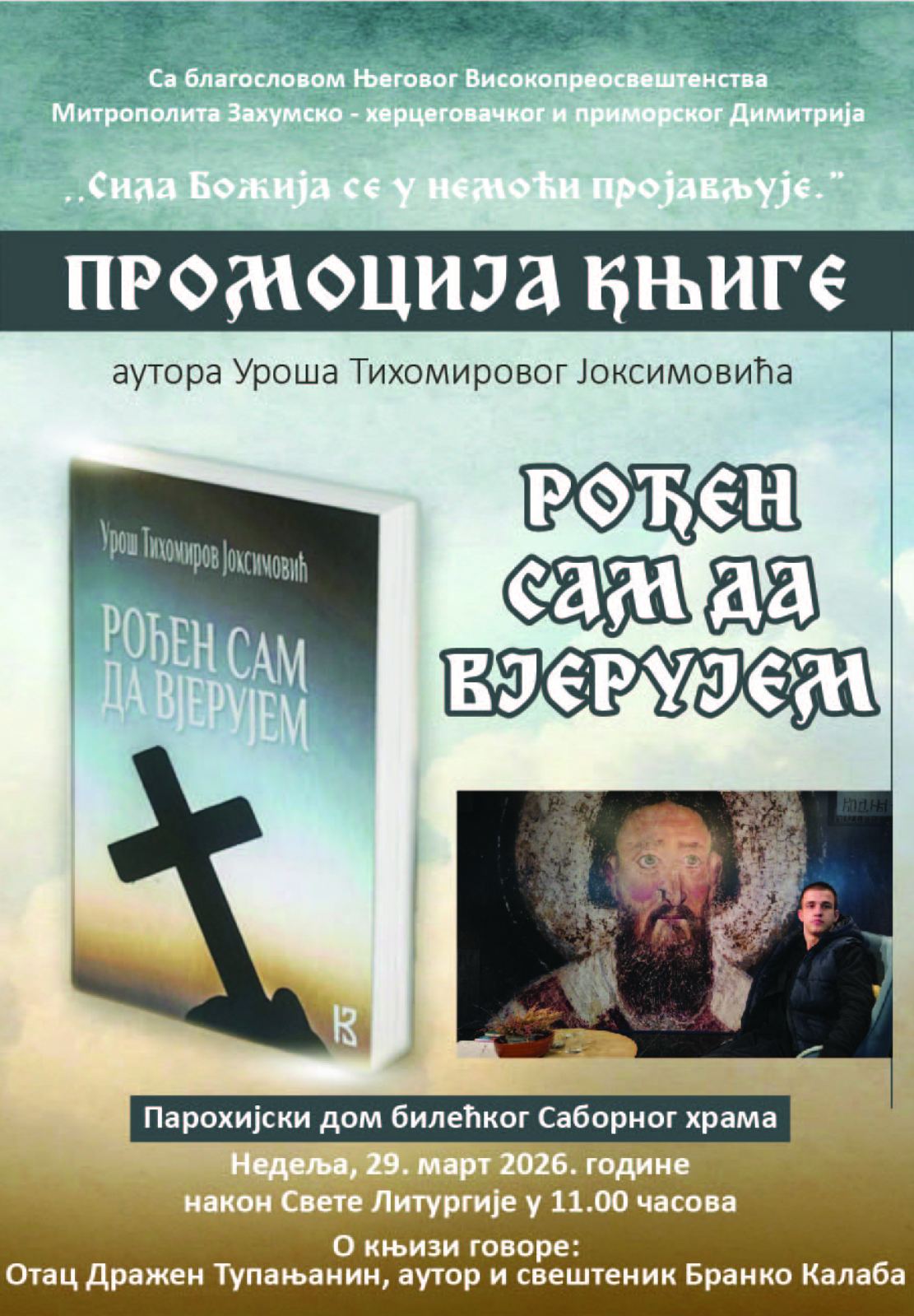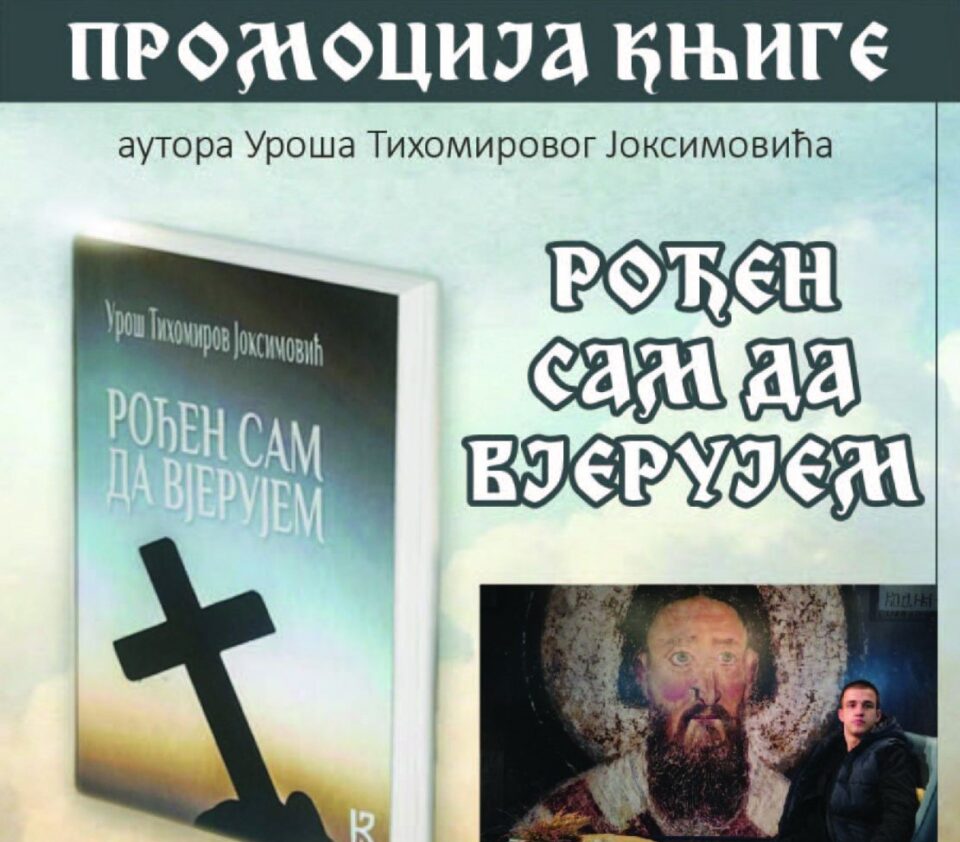 U Bileći će u nedjelju, 29. marta 2026. godine, biti održana promocija knjige „Rođen sam da vjerujem“, autora Uroša Tihomirova Joksimovića. Urošu je ovo 41. po redu promocija ovog djela.