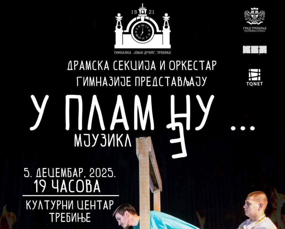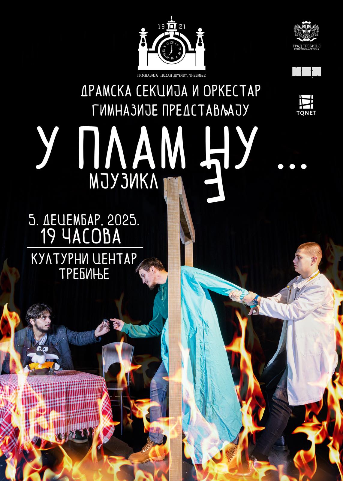 Dramska sekcija i orkestar Gimnazije „Jovan Dučić“ pripremili su novi projekat – mjuzikl pod nazivom „U plamenu…“, koji će premijerno biti izveden 5. decembra 2025. godine u 19 časova u Kulturnom centru Trebinje.