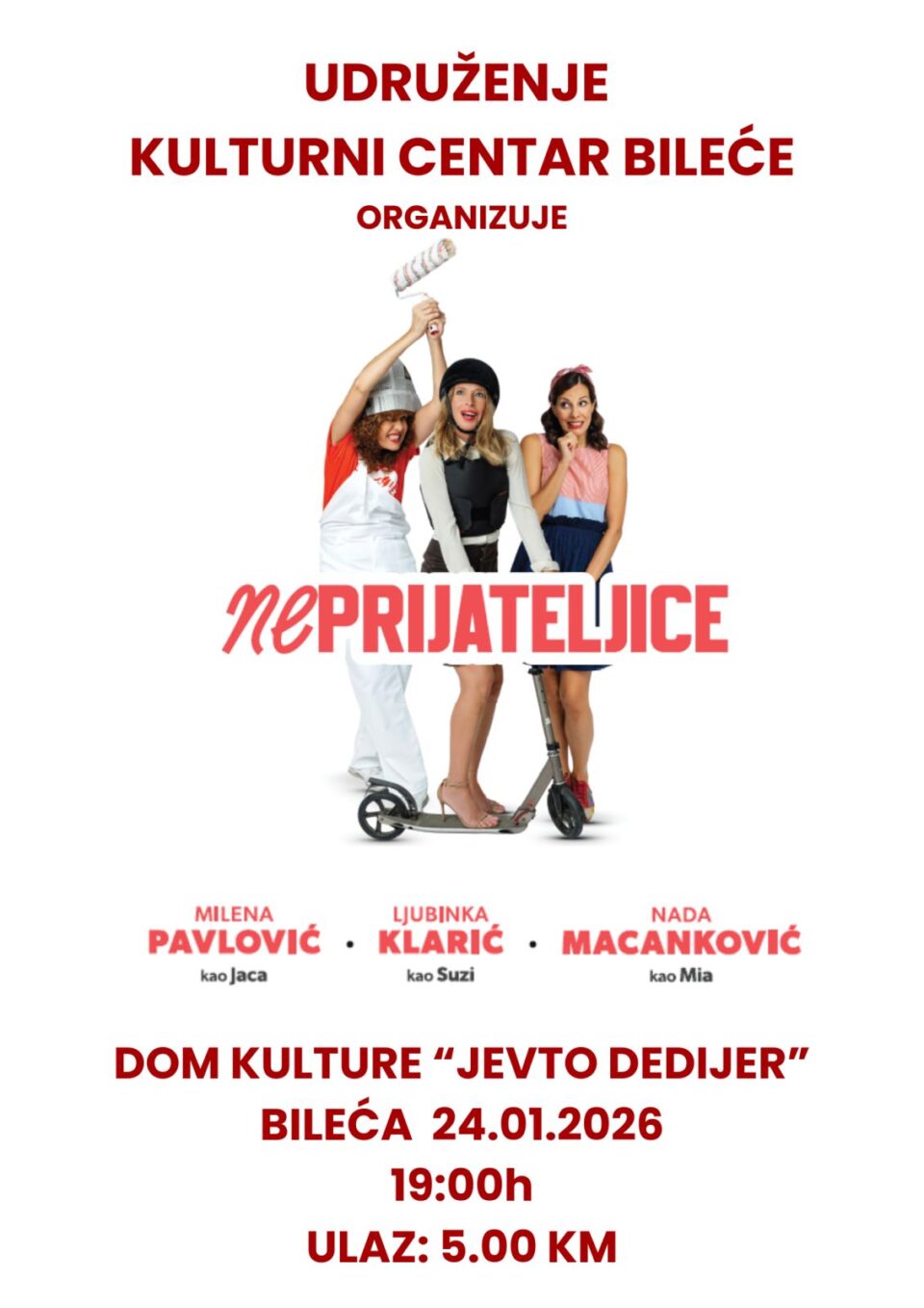 Udruženje Kulturni centar Bileće najavljuje izvođenje pozorišne predstave Neprijateljice, koje će biti održano u Dom kulture Jevto Delije u subotu, 24. januara 2026. godine, sa početkom u 19.00 časova.
