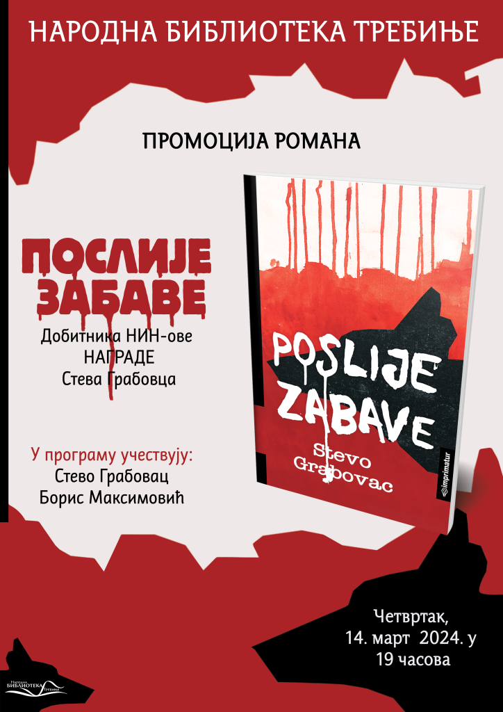 Stevo Grabovac, dobitnik prestižne NIN-ove nagrade za roman „Poslije zabave“ koji je prošle godine objavila izdavačka kuća „Imprimatur“ iz Banjaluke, biće gost Narodne biblioteke Trebinje 14. 03. 2024. godine.