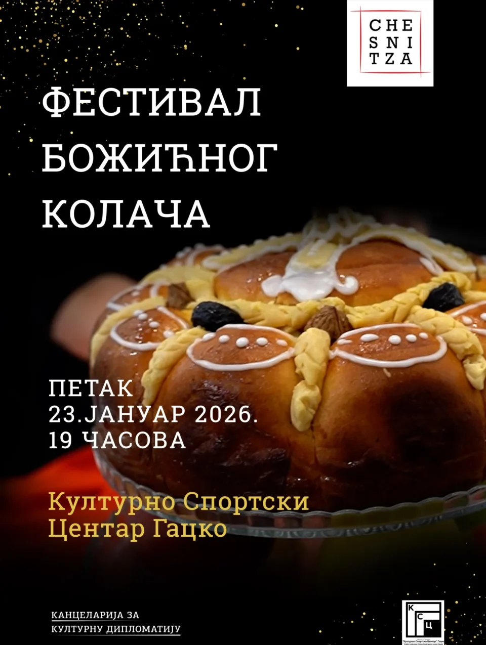 Festival božićnog kolača „Česnica“, značajna i nesvakidašnja izložba obrednih hljebova, u okviru projekta koji predano i sa namjerom očuvanja srpske nacionalne baštine, organizuje dr Gordana Bekčić, direktorica Kancelarije za kulturnu diplomatiju iz Beograda, biće upriličena u petak 23.01.2026 u 19.00 časova u Domu Kulture u Gacku.