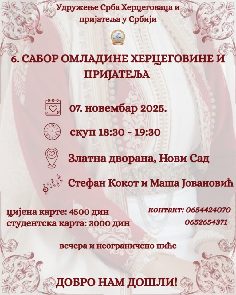 Pozivamo vas na 6. Sabor omladine Hercegovine i prijatelja koji će se održati 7. novembra 2025. godine, u Zlatnoj dvorani, u Novom Sadu (Hajduk Veljkova 11) sa početkom skupa od 18:30 – 19:30.