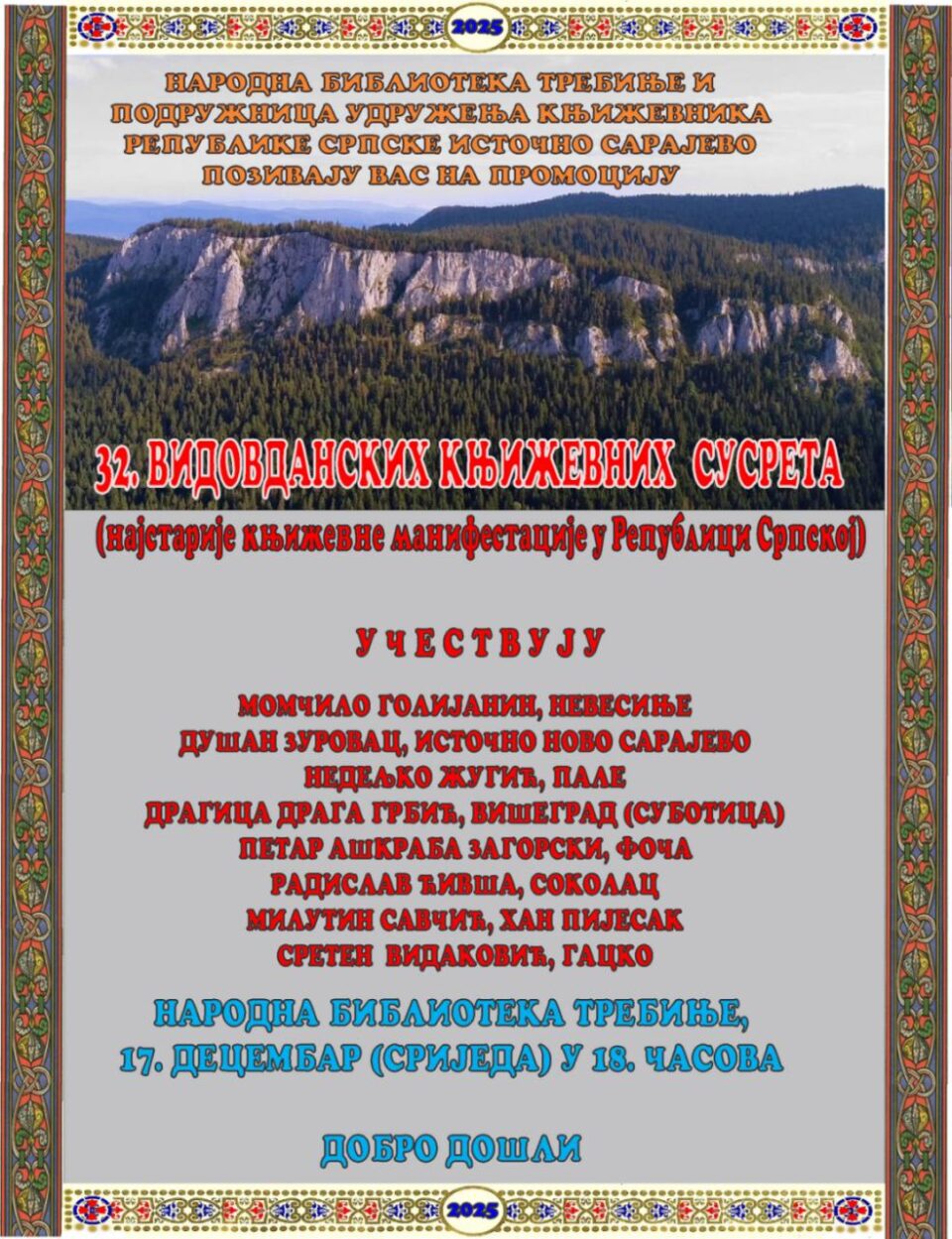 U Narodnoj biblioteci Trebinje danas, 17. decembra 2025. godine, biće održana promocija 32. Vidovdanskih književnih susreta, književne manifestacije koja već više od tri decenije ima značajno mjesto u kulturnom životu Republike Srpske.