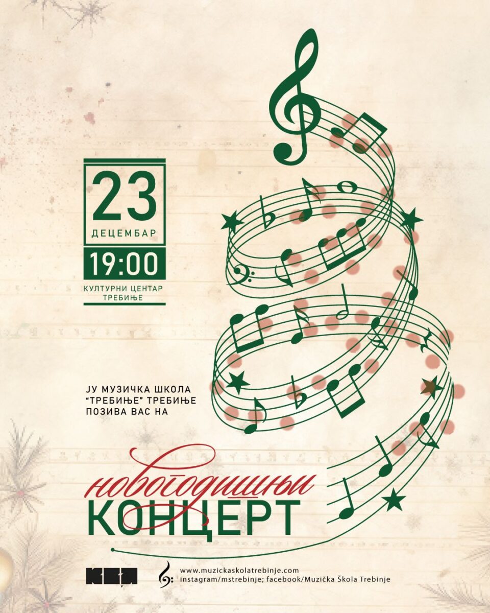 U pozorišnoj sali Kulturnog centra Trebinje, danas, 23. decembra  u 19 časova biće održan tradicionalni novogodišnji koncert učenika i profesora osnovne i srednje Muzičke škole Trebinje.