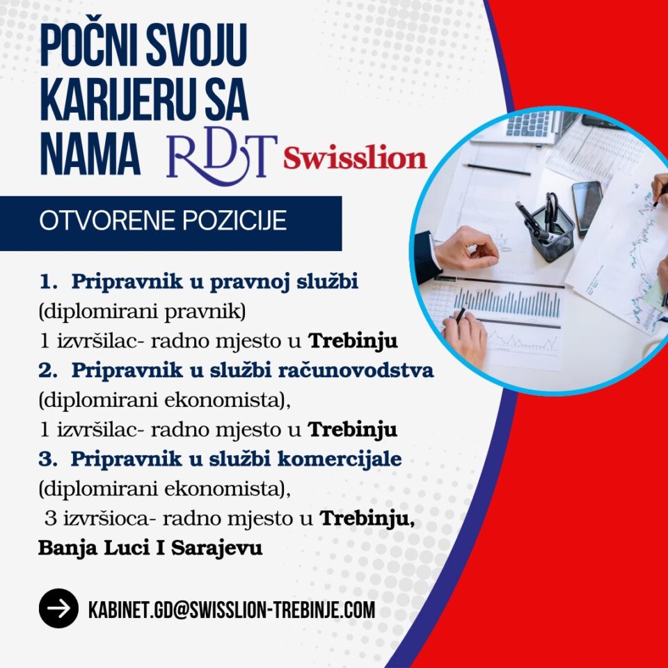 Kompanija RDT Swisslion otvara vrata mladim i ambicioznim profesionalcima koji žele da svoje prvo radno iskustvo steknu u dinamičnom i uspješnom okruženju. Tražimo pripravnike koji su spremni da uče, rastu i daju svoj doprinos našem timu.